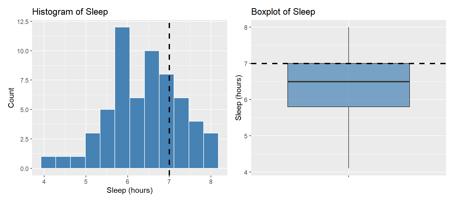 - \(H_0: \mu_{\text{sleep}} = 7\)