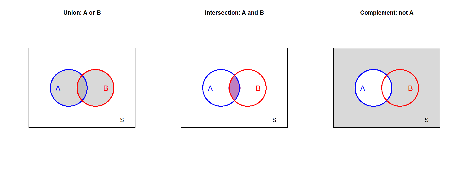 | Complement | \(A^c\) or \(\bar{A}\) | “not A” |