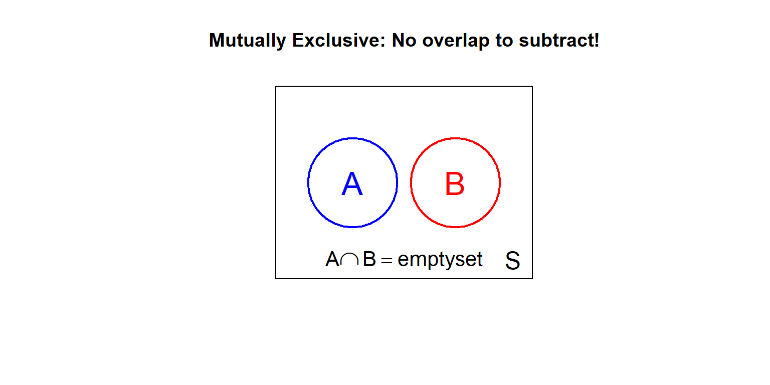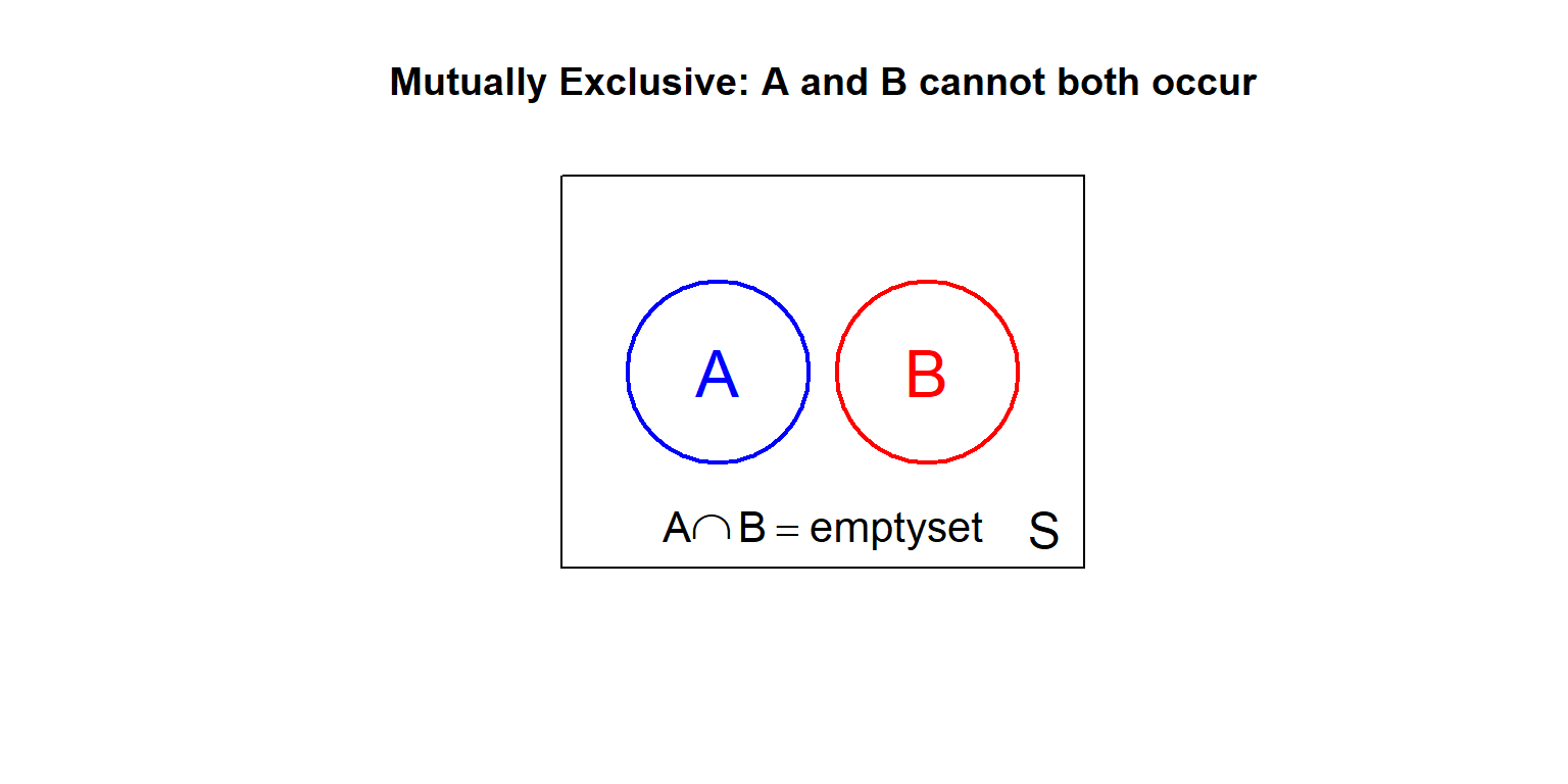 Two events \(A\) and \(B\) are mutually exclusive (or disjoint) if they cannot both occur: