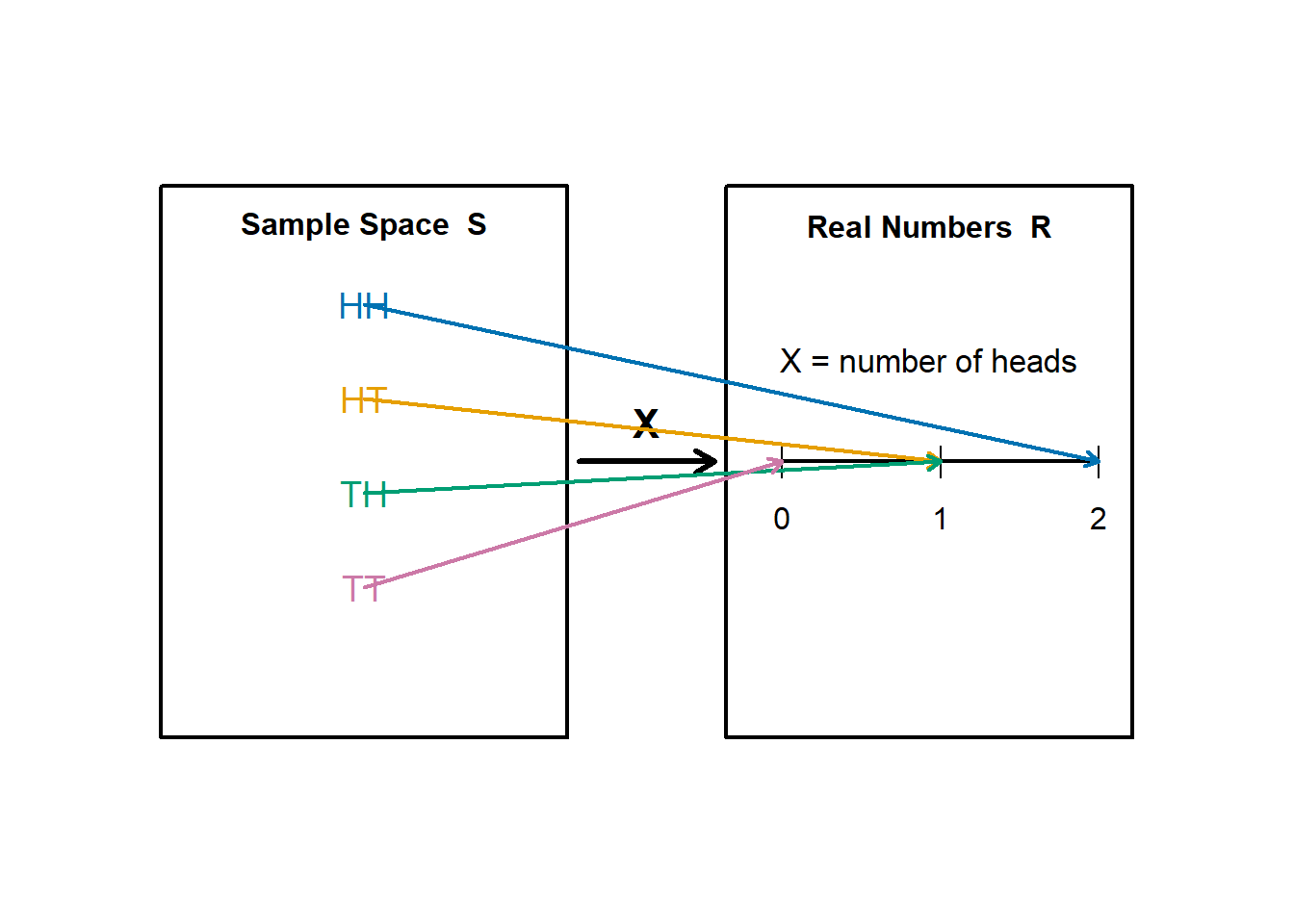 Toss two coins with outcomes \(HH, HT, TH, TT\). Define \(X = \text{number of heads}.\)