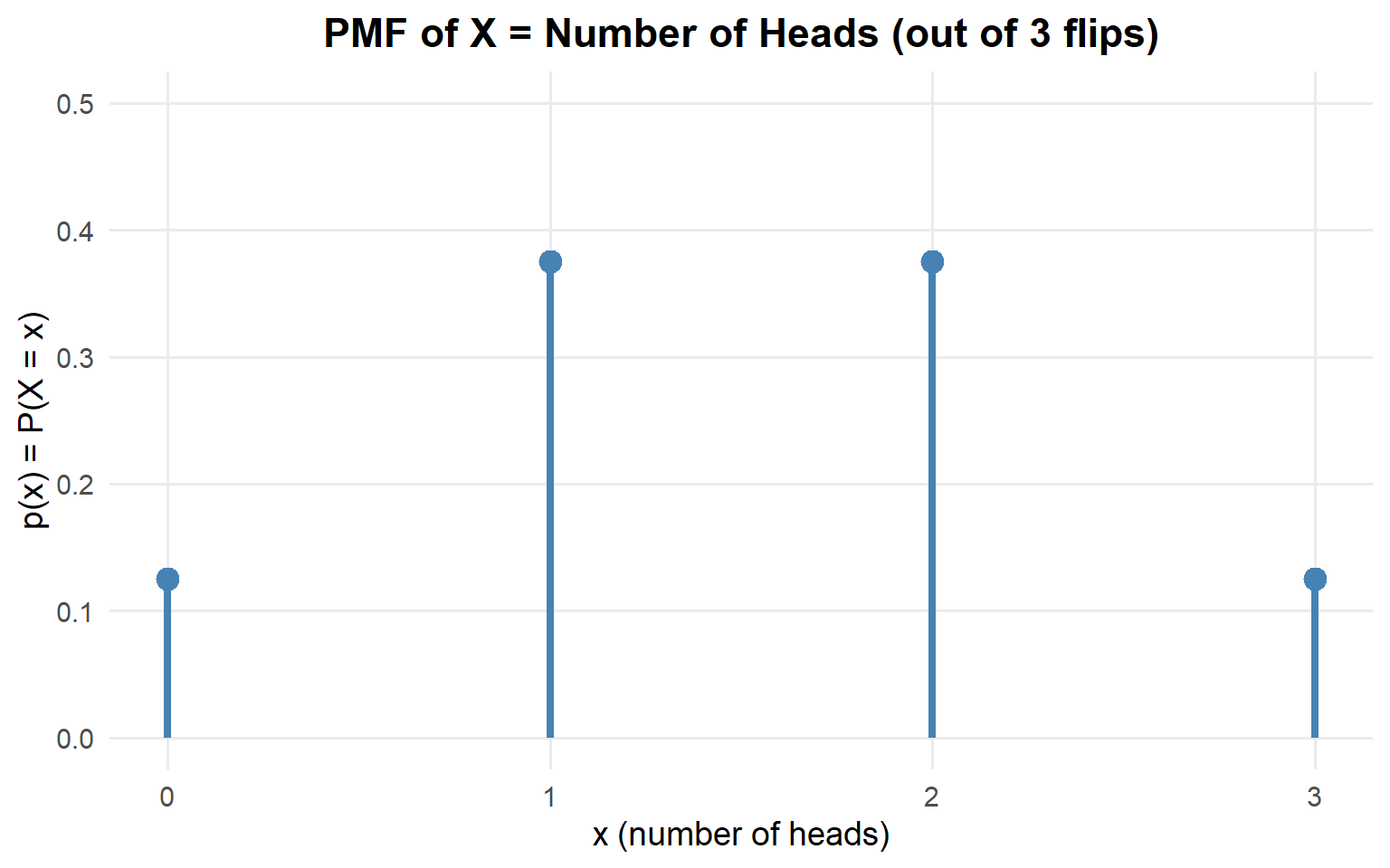 Or as a formula: \(p(x) = \frac{\binom{3}{x}}{2^3}, \quad x \in \{0, 1, 2, 3\}\)