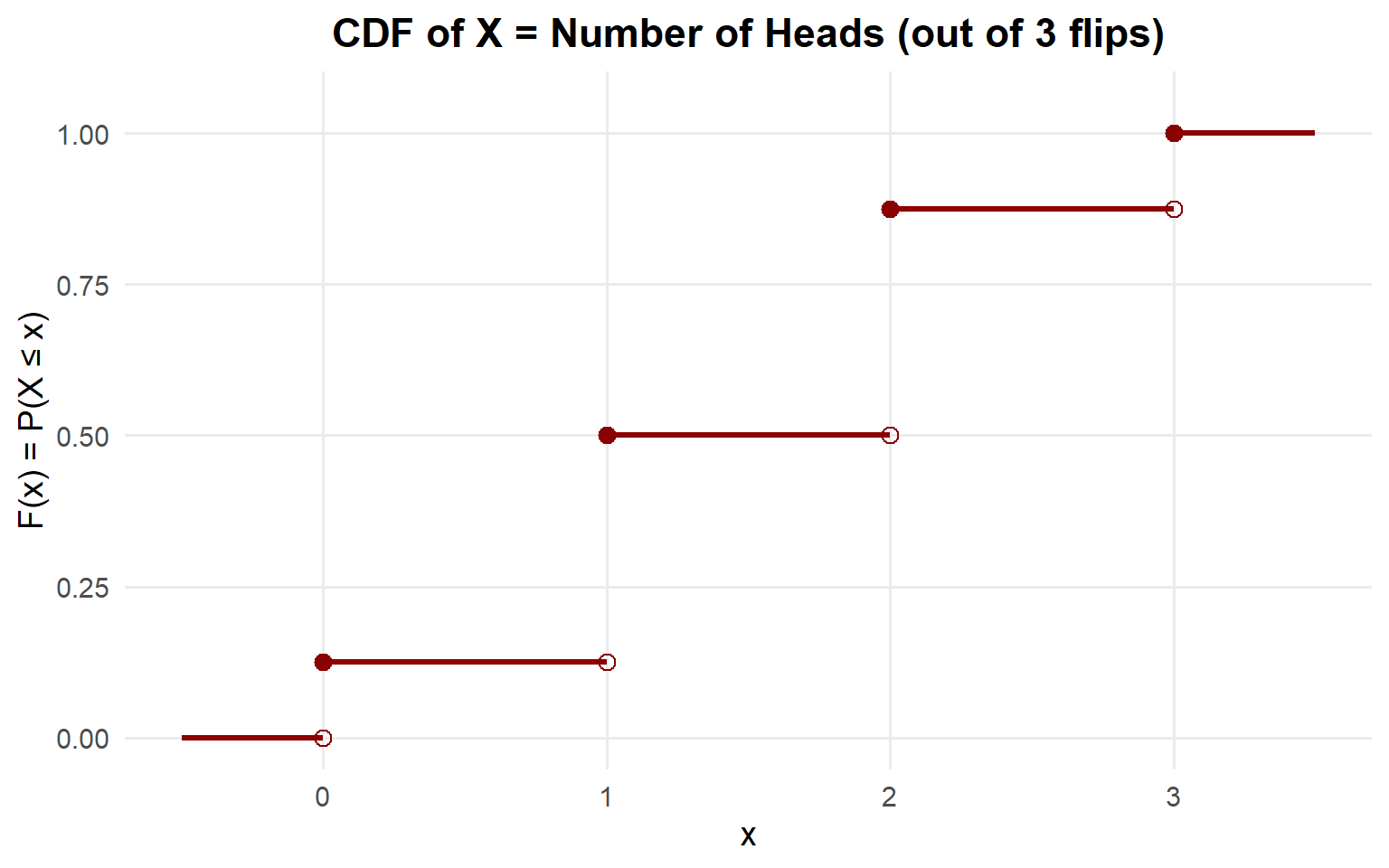 - CDF: \(F(x) = P(X \leq x) = \sum_{y \leq x} p(y)\)