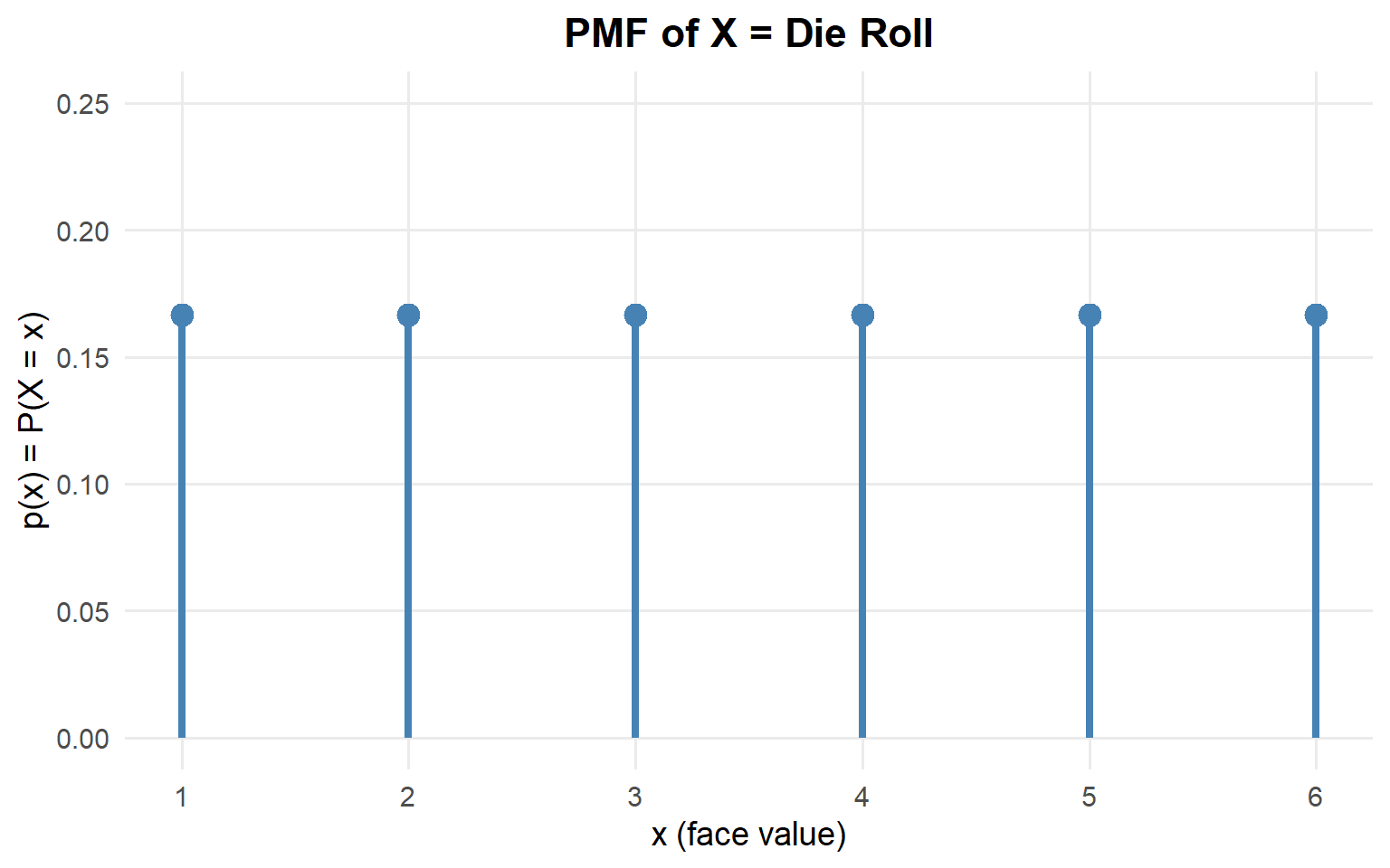 | \(p(x)\) | \(\frac{1}{6}\) | \(\frac{1}{6}\) | \(\frac{1}{6}\) | \(\frac{1}{6}\) | \(\frac{1}{6}\) | \(\frac{1}{6}\) |